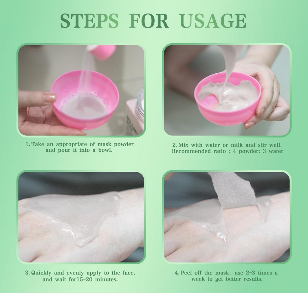 After facial cleansing, mix the jelly mask and purified water until it is particle-free and apply evenly on the face and neck. After 15-20 minutes, peel off to remove.