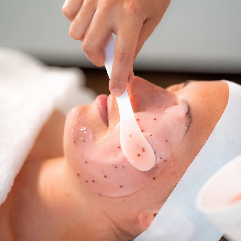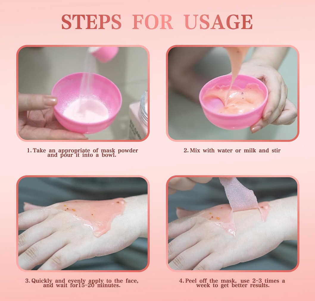 After facial cleansing, mix the jelly mask and purified water until it is particle-free, and apply evenly on the face and neck. After 15-20 minutes, peel off to remove.