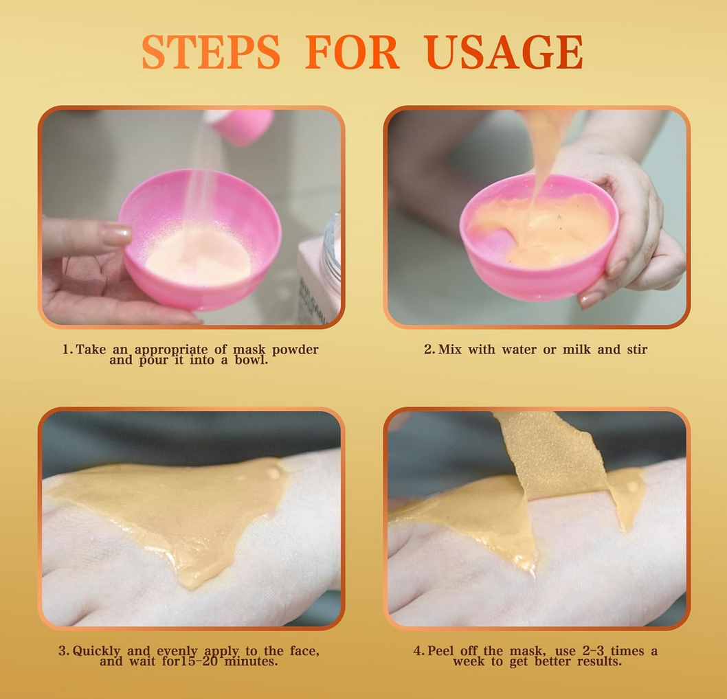 After facial cleansing, mix the jelly mask and purified water until it is particle-free and apply evenly on the face and neck. After 15-20 minutes, peel off to remove.